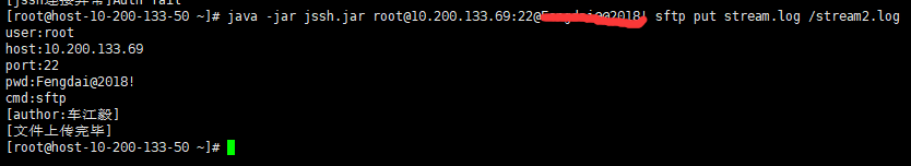 java -jar jssh.jar root@10.200.133.69:22@123456 sftp put c:/setting.xml /root/setting.xml