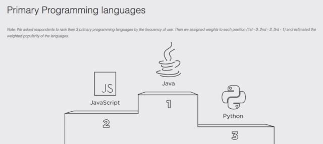 下图中蓝色所代表的是频繁使用,橙色所表示的是即将采用或迁移。从中我们可以看到,JavaScript 是使用最多的语言,占比 64%,其次是 HTML/CSS,而 Java 则屈居第三,果然应了 Jeff Atwood 那句“任何能够用 JavaScript 实现的应用,最终都必将用 JavaScript 实现”。