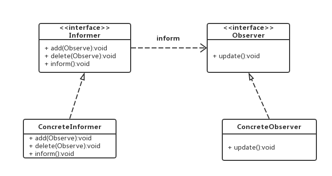 - 抽象通知者:基本结构为通知观察者、添加观察者和删除观察者,比如add(),delete(),notify()这些方法,如下图的Informer