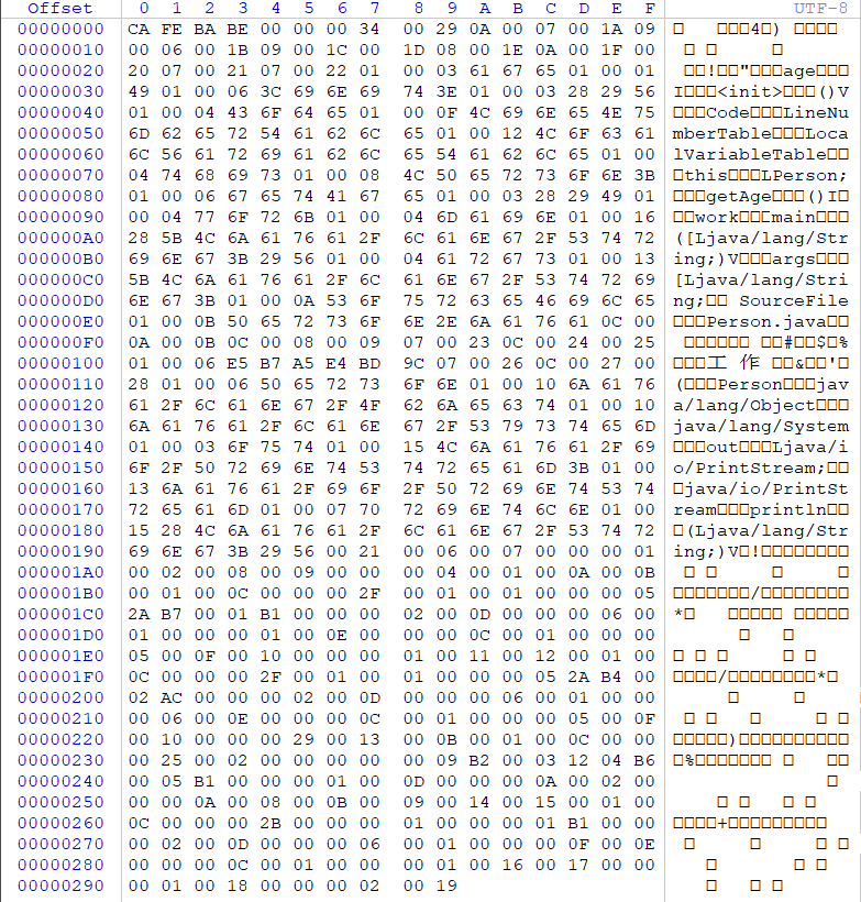 魔数站每个Class文件的头4个字节,其作用未确定 确定这个文件是否为一个能被虚拟机接受的Class文件 示例中CA FE BA BE为魔数