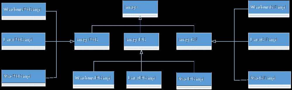 Image是一个公共抽象父类,每一种图片格式,如ImageJPG、ImagePNG等都作为Image的直接子类,不同的图片格式具有不同的解析方法,可以得到不同的像素矩阵。由于每一种图像又需要在不同的操作系统中显示,不同的操作系统在屏幕上显示像素矩阵有所差异,因此需要为不同的图像类再提供一组在不同操作系统显示的子类,如ImagePNG又提供了三个子类WindowsPNGImpl、LinuxPNGImpl和MacPNGImpl,分别在Windows、Linux和Mac上面显示。