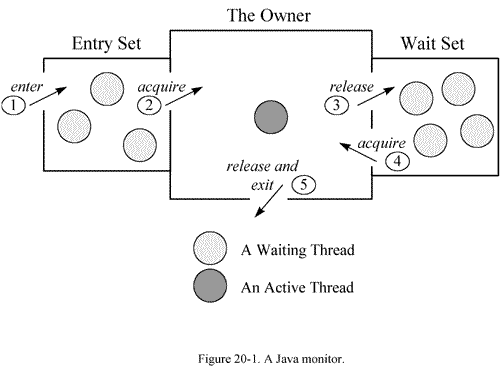 如上图,每个Monitor在某个时刻,只能被一个线程拥有, 该线程就是 “ActiveThread”,而其它线程都是 “Waiting Thread”,分别在两个队列“Entry Set”和“Wait Set”里等候 。在“Entry Set”中等待的线程状态是“Waiting for monitor entry”,而在“Wait Set”中等待的线程状态是“in Object.wait()”。