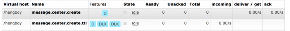 我们声明了 消息通知队列 的相关 Exchange 、 Queue 、 Binding 等配置,将 message.center.create 队列通过路由键 message.center.create 绑定到了 message.center.direct 交换上。