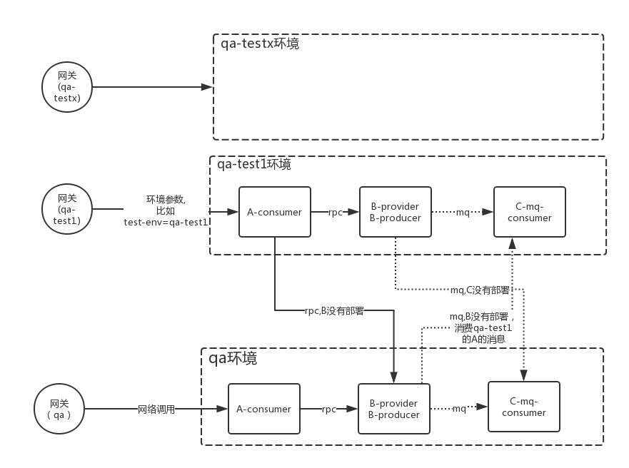 一般公司都会有开发环境、测试环境、线上环境,测试环境主要用于给测试人员测试每次新功能开发后提交的代码。随着公司业务的增长,这时候同时测试的新功能会越来越多,之前搭建的测试环境,一般是一到三个,这时候同时测试的功能数量远远大于测试环境的个数,就会导致测试人员会等待,有点像一个双核cpu要执行4个任务,并且每个任务不能切换执行,所以只能一个一个执行完,这样的执行过程就会导致测试的效率低下。对于这个问题,通常我们有几种解决方式。其中最简单的就是再多增加几套测试环境,这个方式也是业界用的最多的,它的优势在于新的环境是一套完整的隔离的环境,对其他环境没有影响,劣势在于每次搭建这样一套完整的测试环境需要所有的应用都部署一次,这个过程需要很多硬件资源,同时需要所有应用都在代码里面增加一个环境的配置文件然后再发布一次,整个过程下来是很耗费时间的。这时候就有了第二种方式,那就是只部署需要测试的几个应用,通过传递请求头参数,同时改造底层的服务调用框架,这时候部署的几个应用的调用链路还是是完整的,同时对于测试的功能也是完全隔离的,这样的方式能显著提高应用部署到新的测试环境,提供测试的测试效率。本文就基于后面的方式给出一些技术方案和一些遇到的问题。