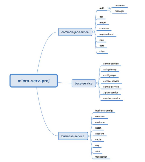 某企业支付产品,处于初级运营阶段,为客户、商户提供入驻、充值、结算等服务。产品基于SpringCloud体系构建微服务,项目代码结构图如下。