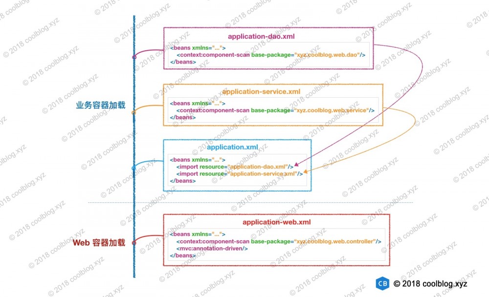 这里我们把配置文件进行分层,结构上看起来清晰了很多,也便于维护。这个其实和代码分层是一个道理,如果我们把所有的代码都放在同一个包下,那看起来会多难受啊。同理,我们用业务容器和 Web 容器去加载不同的类也是一种分层的体现吧。当然,如果应用比较简单,仅用 Web 容器去加载所有的类也不是不可以。