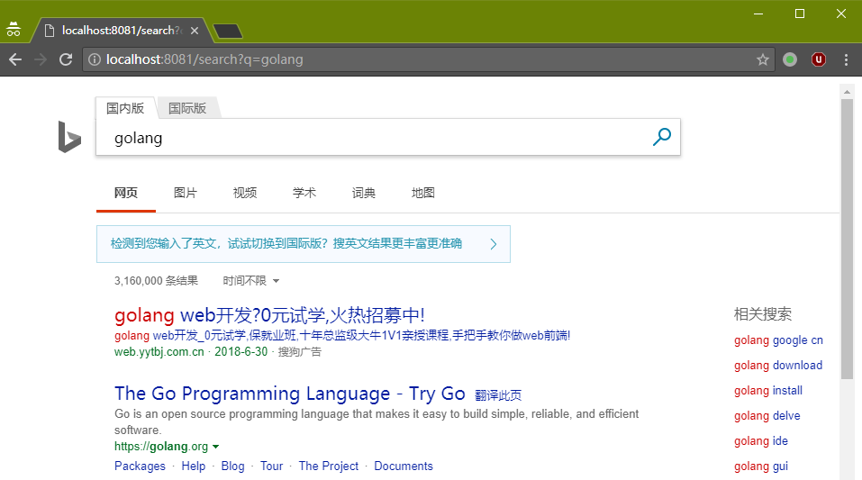 在浏览器中访问 http://localhost:8081/search?q=golang