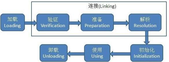 先解析一下这张图,图表示类的整个声明周期,类从被加载到虚拟机内存开始,到卸载出内存为止,包含 7 个阶段,其中验证、准备、解析 3 个阶段统称为连接。