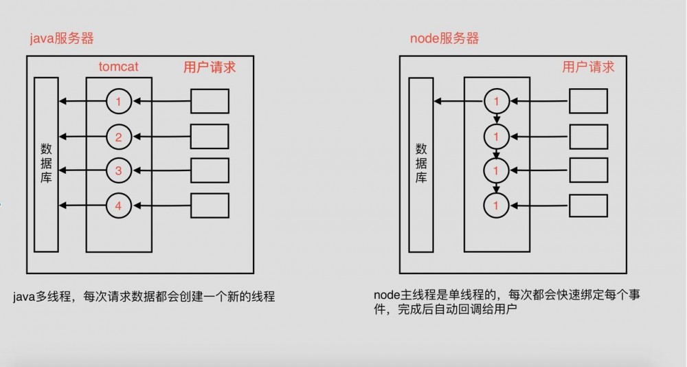 并发 性能,它可以快速通过主线程绑定事件。java每次都要创建一个线程,虽然java现在有个 线程池 的概念,可以控制线程的复用和数量。 (单线程) ,导致其下面的时间无法快速绑定,所以 node不适用于大型密集型CPU运算案例 ,而java却很适合。 web端场景主要是 用户的请求 或者 读取静态资源 什么的,很适合node开发。应用场景主要有 聊天服务器 , 电子商务网站 等等这些高并发的应用。