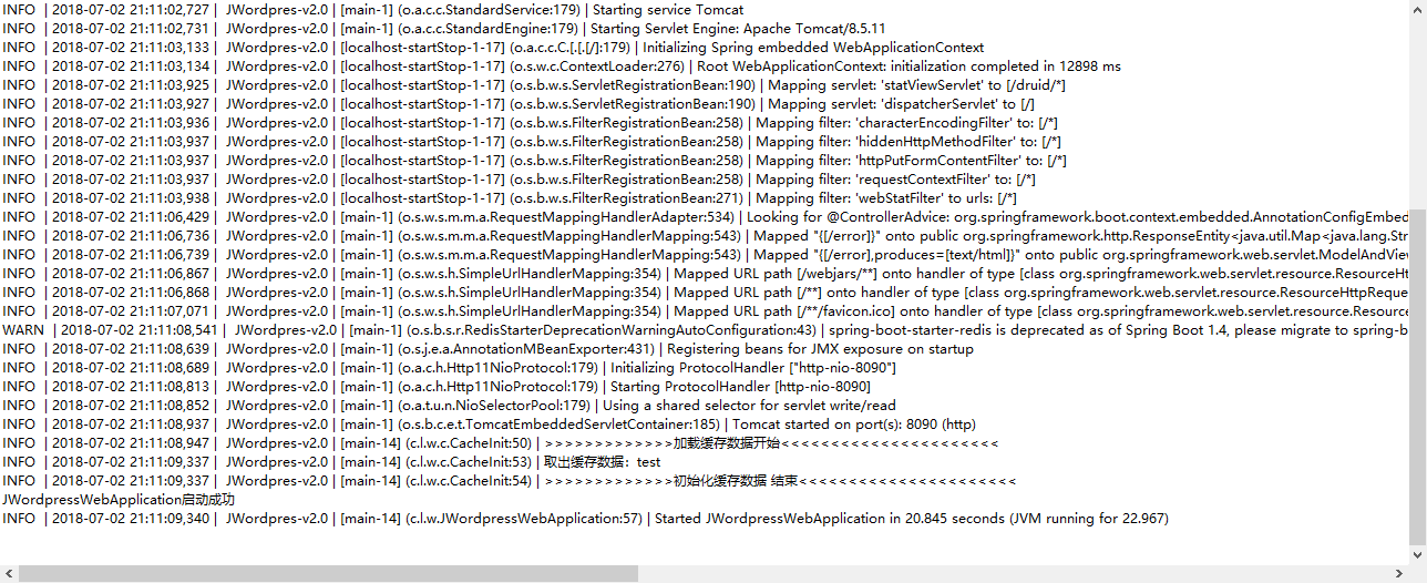 /** * MIT License * Copyright (c) 2018 haihua.liu * Permission is hereby granted, free of charge, to any person obtaining a copy * of this software and associated documentation files (the "Software"), to deal * in the Software without restriction, including without limitation the rights * to use, copy, modify, merge, publish, distribute, sublicense, and/or sell * copies of the Software, and to permit persons to whom the Software is * furnished to do so, subject to the following conditions: * The above copyright notice and this permission notice shall be included in all * copies or substantial portions of the Software. * THE SOFTWARE IS PROVIDED "AS IS", WITHOUT WARRANTY OF ANY KIND, EXPRESS OR * IMPLIED, INCLUDING BUT NOT LIMITED TO THE WARRANTIES OF MERCHANTABILITY, * FITNESS FOR A PARTICULAR PURPOSE AND NONINFRINGEMENT. IN NO EVENT SHALL THE * AUTHORS OR COPYRIGHT HOLDERS BE LIABLE FOR ANY CLAIM, DAMAGES OR OTHER * LIABILITY, WHETHER IN AN ACTION OF CONTRACT, TORT OR OTHERWISE, ARISING FROM, * OUT OF OR IN CONNECTION WITH THE SOFTWARE OR THE USE OR OTHER DEALINGS IN THE * SOFTWARE. */ package cn.liuhaihua.web; import org.mybatis.spring.annotation.MapperScan; import org.springframework.boot.SpringApplication; import org.springframework.boot.autoconfigure.SpringBootApplication; import org.springframework.transaction.annotation.EnableTransactionManagement; import cn.liuhaihua.web.mapper.BaseMapper; /** * @ClassName: JWordpressWebApplication * @Description: Springboot应用程序启动类 * @author Liuhaihua * @date 2018年6月26日 * */ @SpringBootApplication @EnableTransactionManagement @MapperScan(basePackages = "cn.liuhaihua.web.*", markerInterface = BaseMapper.class) public class JWordpressWebApplication { /** * @Title: main * @Description: main启动方法 * @param @param args * @return void * @throws */ public static void main(String[] args) { SpringApplication.run(JWordpressWebApplication.class, args); System.out.println("JWordpressWebApplication启动成功"); } }配置文件如下,主要配置服务端口和tomat最大最小线程数