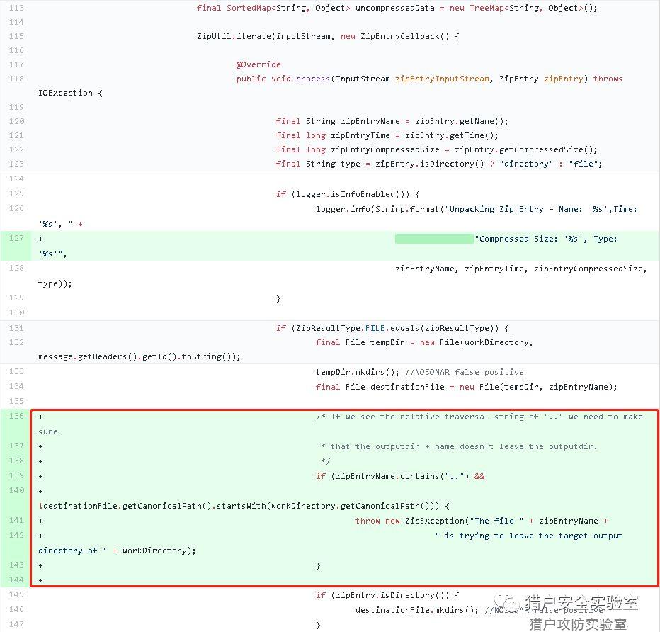 zip.v1.0.1.RELEASE在UnZipTransformer调用ZipUtil.iterate()时定义的回调中增加了一段对文件名称校验的代码片段(在5月11日凌晨更新的zip.v1.0.2.RELEASE版本中,对Byte[]类型的分支逻辑也增加了文件名称校验,并且删除了对名称中..的判断,直接校验名称是否以工作区目录开头)。