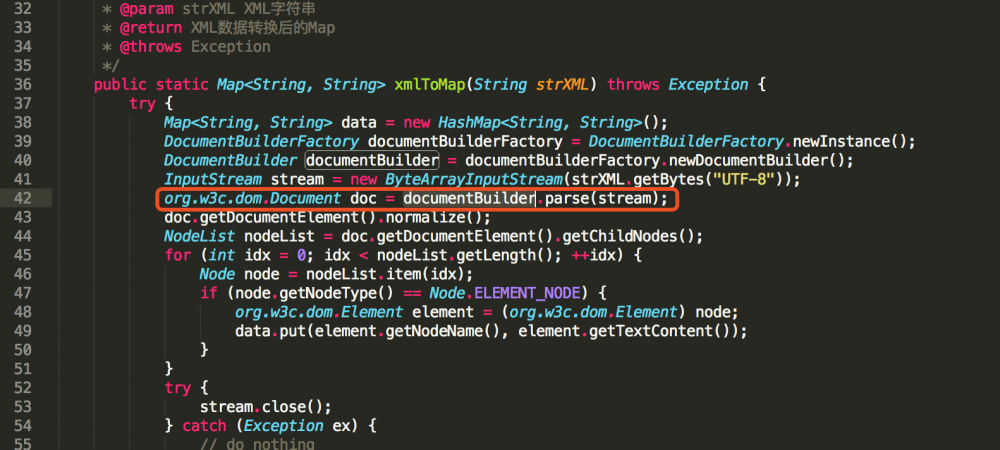 漏洞位置在: java-sdk-v3/src/main/java/com/github/wxpay/sdk/WXPayUtil.java , 第42行: