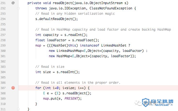 当LinkedHashSet被反序列的时候,会调用其父类HashSet的readObject方法。