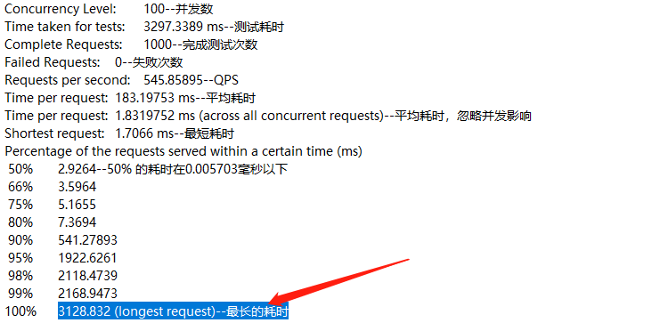 上图测试结果很明显有问题,做长的请求3秒多,这是不能接受的,通过分析,定位到连接池设置过小,数据库连接过小,并发过大,导致请求阻塞等待资源中,优化方式:加大连接池线程数,加大数据库连接数