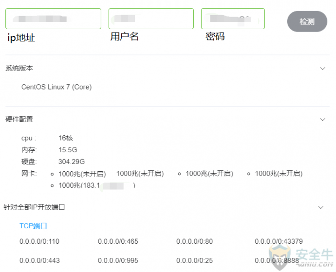 最后,我们通过这种方式,根据不同的需求拼接指令,将执行后的反馈消息,解析出关键信息,如内存大小、磁盘大小、防火墙策略等封装成类,配合前端就能达到图一显示的效果。