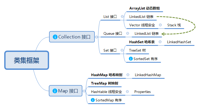 类集框架最上层定义了两个接口,Collection 和 Map,Collection 叫做集合接口,每次只保存一个对象;Map 叫做映射接口,每次保存一对对象: