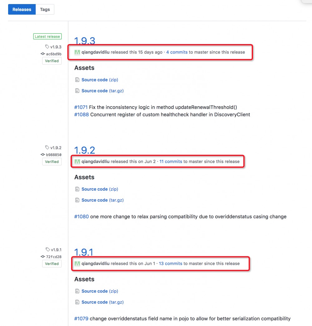 不妨来看一下Eureka的发布历史: https://github.com/Netflix/eureka/releases