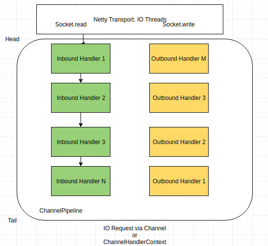 ChannelPipeline是Channel的负责组织ChannelHandler的组件,如上图所示,想象远端为上方,最上面为head,近端为我们的程序,最下面为tail。一个inbound事件,通常为读到的消息、用户自定义事件等会从上而下经过各个ChannelInboundHandler。而Outbound事件通常为write消息等,会经过ChannelOutboundHandler处理。