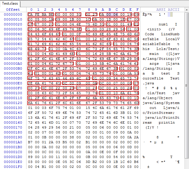 上面结构体的各个变量的定义的顺序与Class文件中的存储顺序是一致的。下面我们用一个二进制编辑器打开Class文件并简单看下,Class文件中的存储如何与上面的结构体对应的。