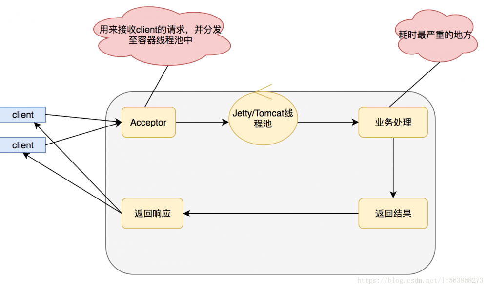 缺点在于,业务逻辑线程和servlet容器线程是同一个,一般的业务逻辑总得发生点IO,比如查询数据库,比如产生RPC调用,这个时候就会发生阻塞,而我们的servlet容器线程肯定是有限的,当servlet容器线程都被阻塞的时候我们的服务这个时候就会发生拒绝访问,线程不然我当然们可以通过增加机器的一系列手段来解决这个问题,但是俗话说得好靠人不如靠自己,靠别人替我分担请求,还不如我自己搞定。所以在servlet3.0之后支持了异步化,我们采用异步化之后就会变成如下: