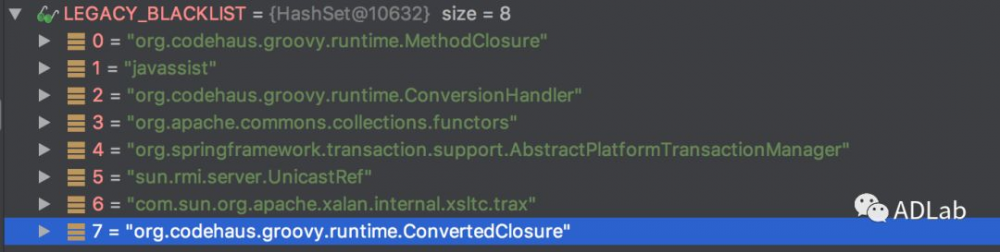 为了阻止恶意反序列化,WebLogic已经设置了8个黑名单。如下图所示: