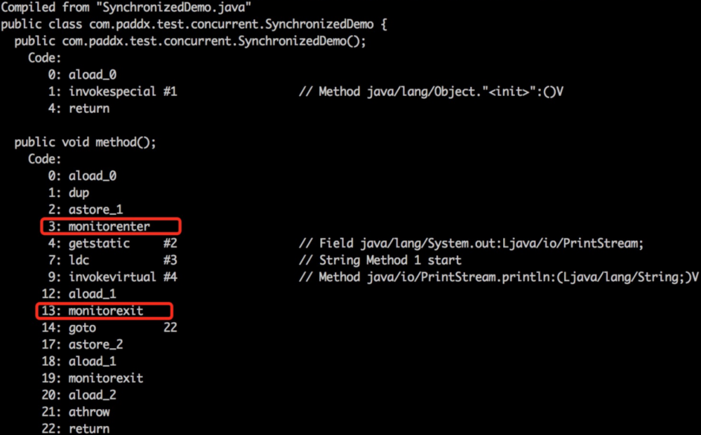 从编译的结果来看,方法的同步并没有通过指令 monitorenter 和 monitorexit 来完成(理论上其实也可以通过这两条指令来实现),不过相对于普通方法,其常量池中多了 ACC_SYNCHRONIZED 标示符。 JVM就是根据该标示符来实现方法的同步的 :