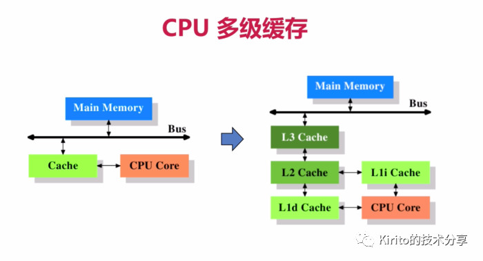 大致可以得出结论,缓存层级越接近于 CPU core,容量越小,速度越快,同时,没有披露的一点是其造价也更贵。所以为了支撑更多的热点数据,同时追求最高的性价比,多级缓存架构应运而生。