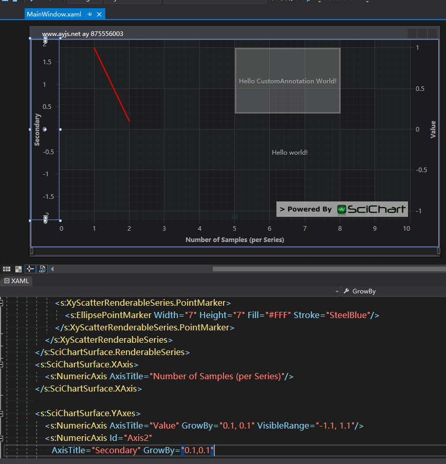 新建空白wpf项目,添加引用,和xmlns:s, 添加如下代码,2个在上方的y轴,一个在左侧的x轴。