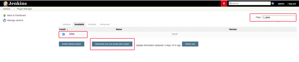 可直接在 Jenkins 中搜索 Gitee 来查找对应插件( Jenkins 官方插件地址 ),或者通过 https://gitee.com/oschina/Gitee-Jenkins-Plugin/releases 下载 hpi 文件并安装到 Jenkins 持续集成系统中。