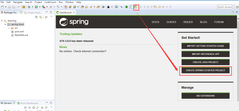Dashboard –> CREATE SPRING STARTER PROJECT 进行创建项目,或者可以选择 file –> new –> Spring Starter Project ,打开创建面板 第一种方式: