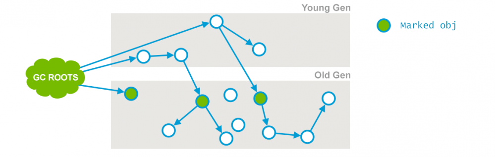 这个是 CMS 两次 stop-the-wolrd 事件的其中一次,这个阶段的目标是:标记那些直接被 GC root 引用或者被年轻代存活对象所引用的所有对象,标记后示例如下所示(插图来自: GC Algorithms:Implementations —— Concurrent Mark and Sweep —— Full GC ):