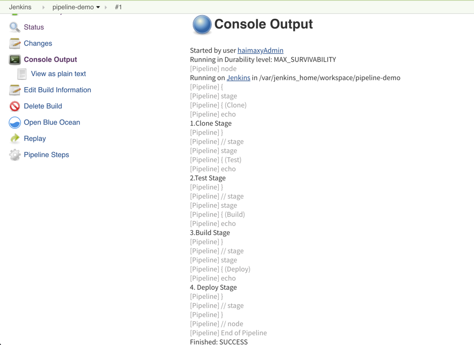 我们可以看到上面我们 Pipeline 脚本中的4条输出语句都打印出来了,证明是符合我们的预期的。