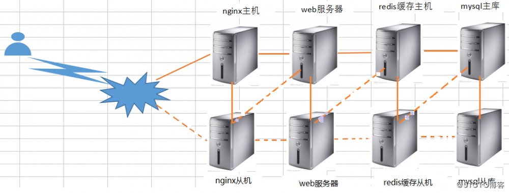 本案例设计采用四层模式来实现,主要分为前端反向代理、web层、数据库缓存层、数据库层。