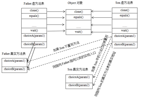解释2:如果子类重写父类方法,那么执行的是子类的方法,这是因为子类方法表中地址将会被替换为指向子类实现版本的入口地址。即:Son的choiceA与choiceB方法被重写了,则指向了Son实现版本的入口地址,并没有指向Father的箭头。