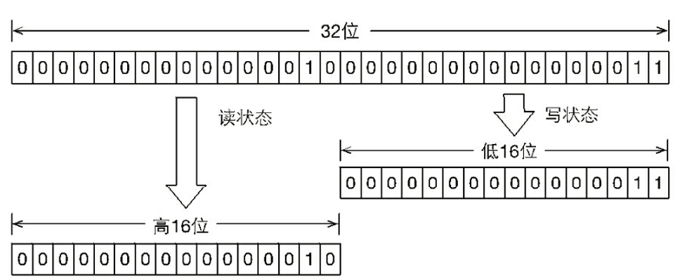 ReentrantReadWriteLock通过按位切割state变量, 同步状态的低16位表示写锁获取次数,高16位表示读锁获取次数 ,如图示意