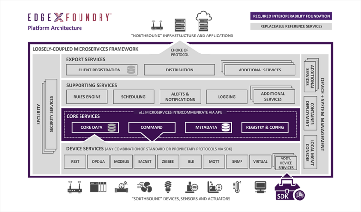 EdgeX Foundry于2017年7月底宣布,其目标是为物联网边缘计算开发标准化的开源互操作性框架。该框架促进了跨边缘分析,安全性,系统管理和服务的互操作性代码,并简化了物联网网关和智能边缘设备的预认证软件的集成。EdgeX Foundry正在创建一套开源EdgeX堆栈,将在多个传感器网络消息传递协议以及云和分析平台之间进行协调。