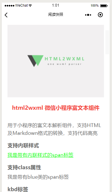 目前仅实现解析Html并转换成JSON,将生成的JSON通过接口访问返回给微信小程序端, 微信小程序端使用html2wxml组件版 按照html2wxml教程配置即可