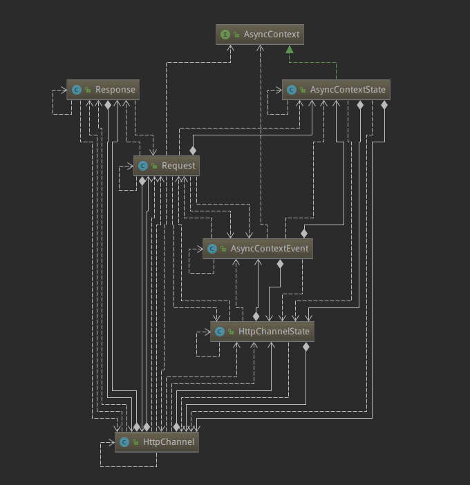 当业务在调用request.startAsync时,将会直接创建一个 AsyncContext 对象。按照标准API的定义,相应的context会将相应的request和response封闭在内部,以供业务端使用。在jetty中,整个模型结构参考如下所示。