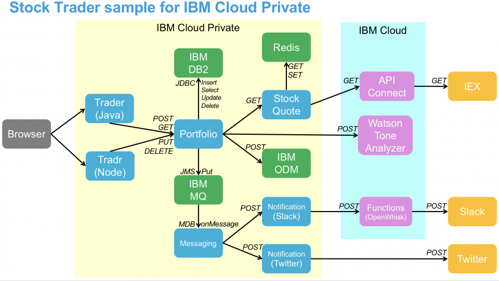 如您所见, portfolio 微服务位于应用的中心,是标准的 Model View Controller (MVC) 架构中的 控制器(controller) ,可通过提供 视图 的选定客户端进行访问。这个微服务负责使 JDBC 保证持久性,使用 JMS 进行消息传递,并在 IBM Operational Decision Manager (ODM) 中进行 REST 调用以获取股票报价或推动业务规则;此外,它还可以在公共 IBM Cloud 中驱动 Watson ,并调用 API Connect 中的 API。这里还有一个旧式的 Enterprise Java Bean (EJB),具体来说,是一个 Message Driven Bean (MDB),它可以监听来自 portfolio 的消息,并且可以调用 通知 服务。 通过使用可按投资组合指定的 Istio 路由规则(后续文章将会对此进行探讨),它可以将通知发送至 一个 Slack 频道(使用”无服务器” IBM Cloud Functions 操作序列),或者以推文形式推送至 @IBMStockTrader Twitter 帐户。