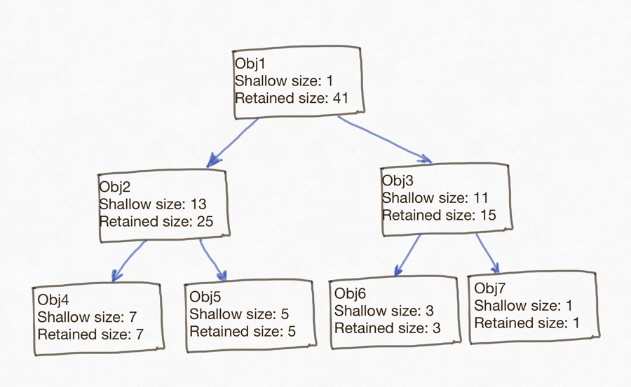 Retained sizeof an object is its shallow size plus the shallow sizes of the objects that are accessible, directly or indirectly, only from this object. In other words, the retained size represents the amount of memory that will be freed by the garbage collector when this object is collected.