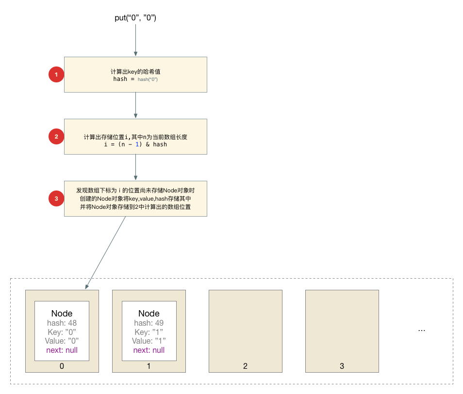 // 2. 根据key的hash值计算出Node存放在数组中的位置,如果为null则直接存储