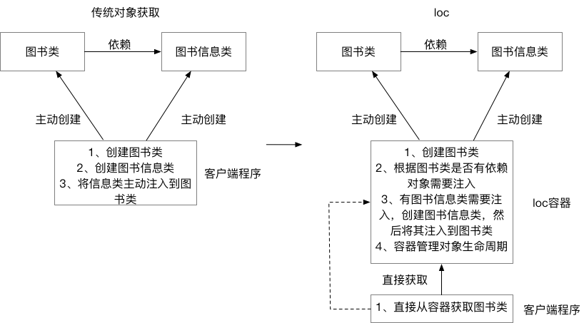 从图中我们直观的看出Ioc将对象依赖的获取权利由原来的客户端程序反转到Ioc容器
