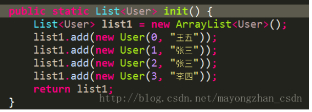 这个类很简单就是模拟两个线程一个操作同一个对象static List< User > list1