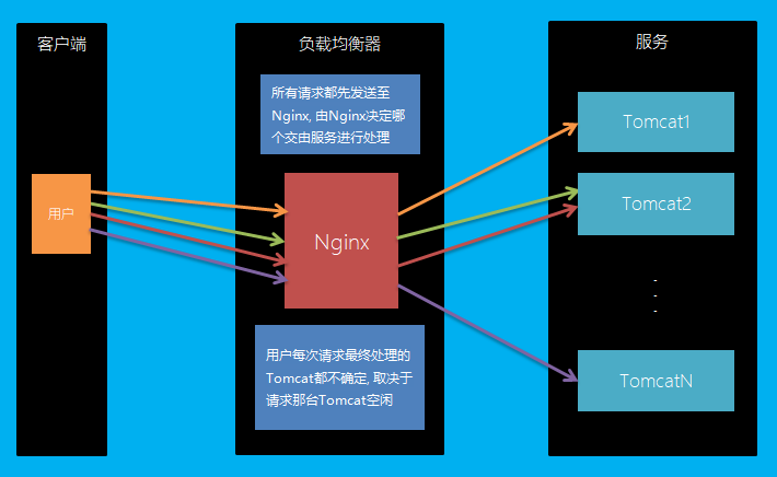 WEB负载均衡方案很多, Nginx + Tomcat 是常用的方案之一. Nginx作为负载均衡器根据每个Tomcat的负载情况进行分流.