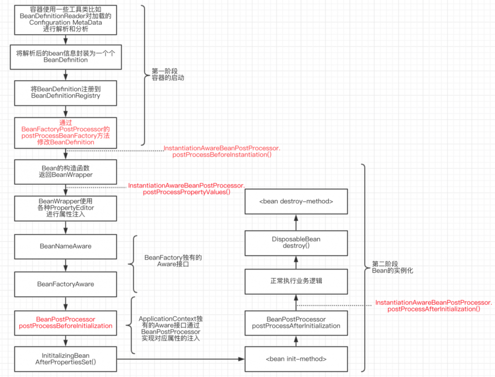 1)BeanFactory默认lazy-load,所以启动较快 常用的一个实现类是DefaultListableBeanFactory,该类还实现了BeanDefinitionRegistry接口,该接口担当Bean注册管理的角色 registerBeanDefinition#BeanDefinitionRegistry bean会以beanDefinition的形式注册在BeanDefinitionRegistry中 BeanFactory接口中只定义了一些关于bean的查询方法,而真正的工作需要其子类实现的其他接口定义~