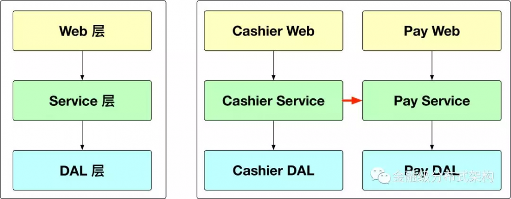 当这个系统承载的业务变多了之后,系统可能演化成上图中右边的这种方式。在上图的右边的部分中,一个系统承载了两个业务,一个是 Cashier(收银台),另一个是 Pay(支付),这两个业务可能会有一些依赖的关系,Cashier 需要调用 Pay 提供的能力去做支付。
