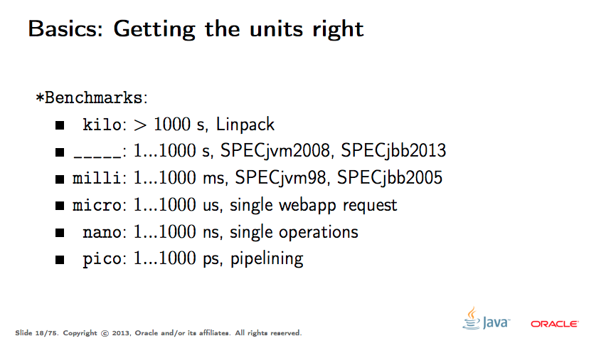 Aleksey 给出了 micro 测试的耗时数量级,这意味着 JMH 测试可以达到 微秒 级别的的精度。