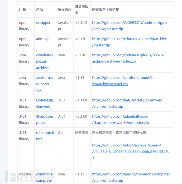 目前只要是使用存在Zip Slip漏洞的库,且没有进行目录遍历验证的程序或直接包含易受攻击代码的程序都将受此漏洞影响。如下是受影响的库: