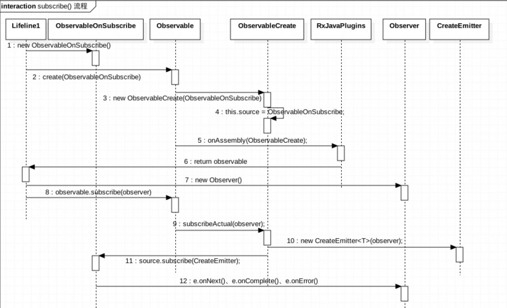 把 subscribe() 放在前面是因为后续的 subscribeOn() 和 observeOn() 流程都它的支撑,但是单纯的分析 subscribe() 流程没多大意义,所以这个流程基于 observable.subscribe(observer) :