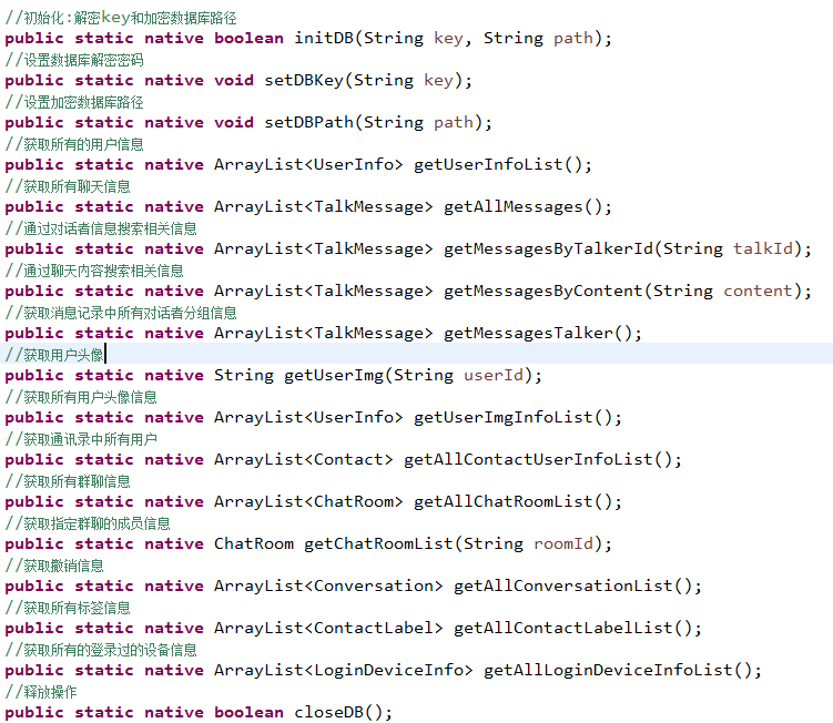 在之前我们已经知道了微信数据库保存的目录MicroMsg,我们只需要这个目录就可以进行解密操作了,主要是读取这个目录下的几个cfg文件即可。从这里可以了解本文就是利用这个案例来给大家介绍Java中如何调用DLL文件实现和底层交互,因为在之前我们已经了解了VS2017中用C++利用sqlite3进行了数据库解密操作了。所以我们可以这么划分,把数据库密码获取放在Java层操作,因为这样会更方便,然后把一些数据库操作都放在C++中,把查询的数据结果返回给Java层进行渲染即可。这里我们先把native接口定义一下: